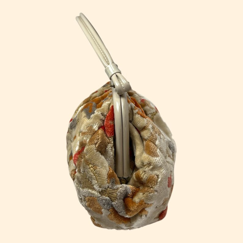 Authentic 1960s vintage handbag featuring a soft floral velvet body in warm tones of red, orange, gold, and gray. The structured design includes a cream enamel-coated frame and matching vinyl handle with silver clasp closure. Interior is lined in golden yellow fabric with gathered trim and open pocket. A beautifully crafted mid century collectible with elegant shape and textured floral pattern.Pre-loved with light wear consistent with age.