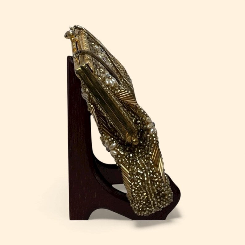 Authentic 1960s vintage evening handbag in radiant gold tones, intricately hand-beaded with floral pearl appliqué accents and metallic chevron design. Features a gold-tone kiss-lock clasp, optional chain handle, and soft satin interior with slip pocket. A stunning mid-century collectible perfect for special occasions, weddings, or vintage fashion collections.
