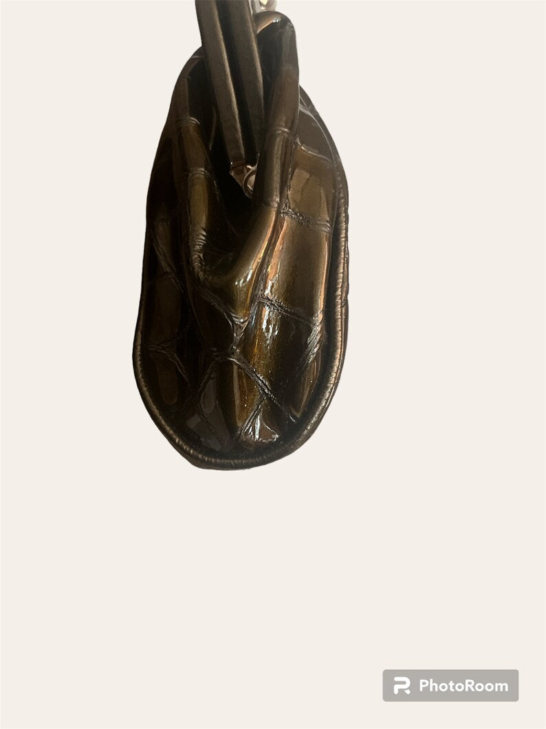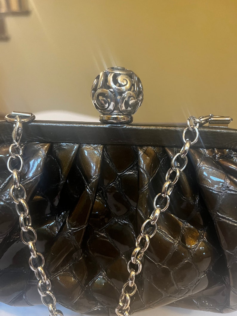 Authentic Brighton handbag in a rare deep green croc embossed leather. This structured purse features Brighton's signature silver tone hardware with a detailed clasp and detachable chain strap, allowing it to be worn as a shoulder bag or carried as a clutch. glossy finish with elegant design makes it perfect for both casual outfits and formal occasion.