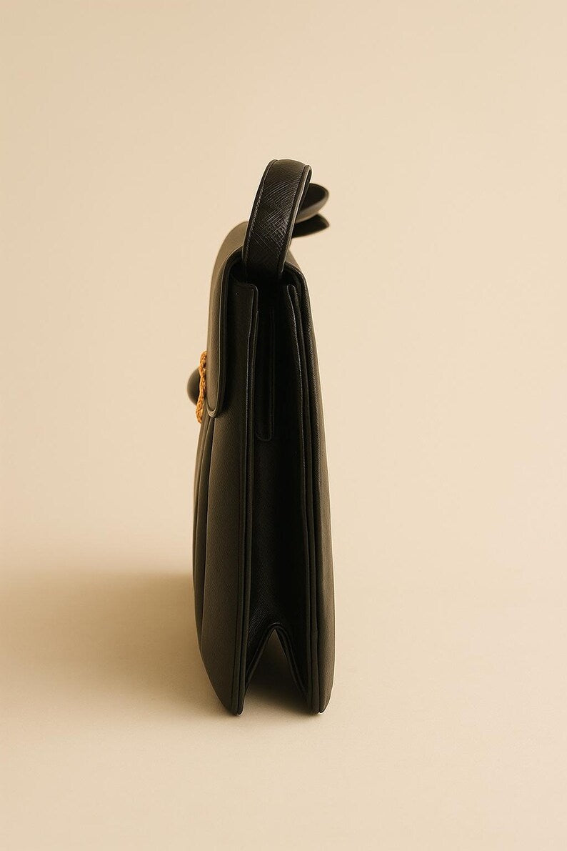 Elevate your vintage collection with this elegant 1960s Prestige handbag, crafted with a structured black body and adorned with a striking gold and black cabochon clasp. Its timeless mid-century silhouette and refined detailing make it a perfect evening accessory or collector’s piece.