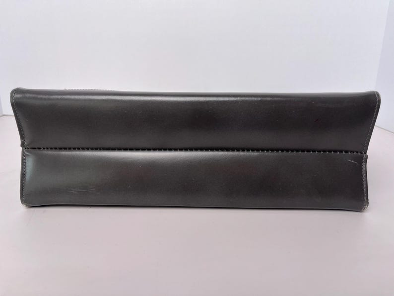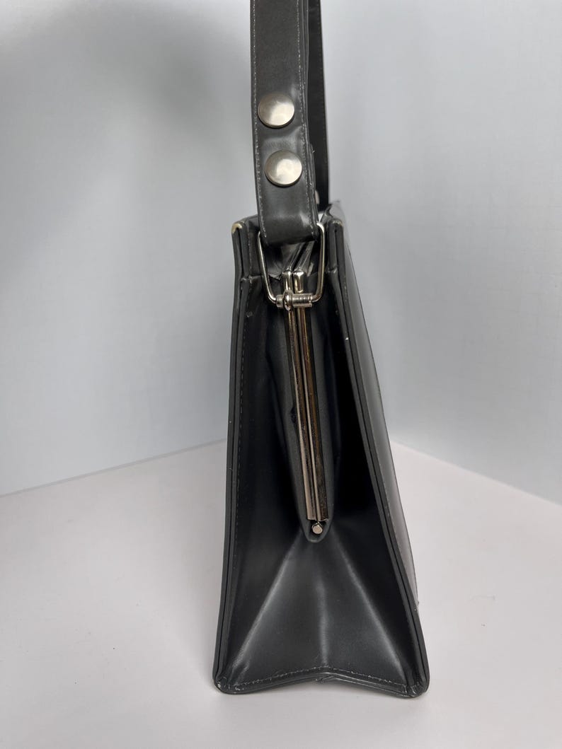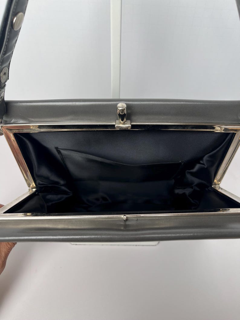 Vintage Mid century gray color handbag with silver clasp closure and geometric light gray design.It has a small pocket for organization and dual shoulder straps.
