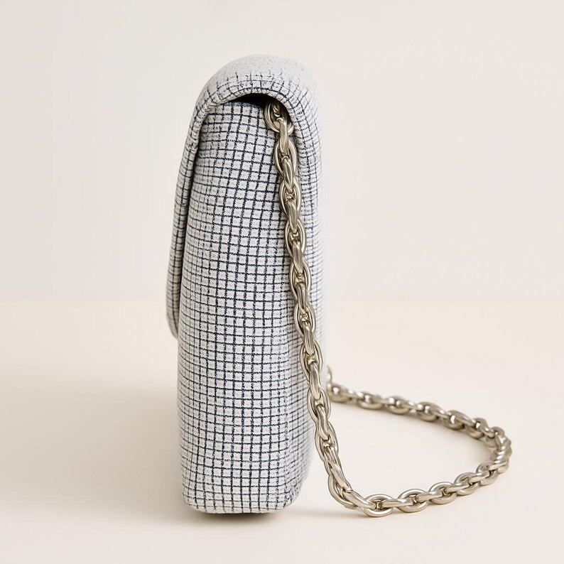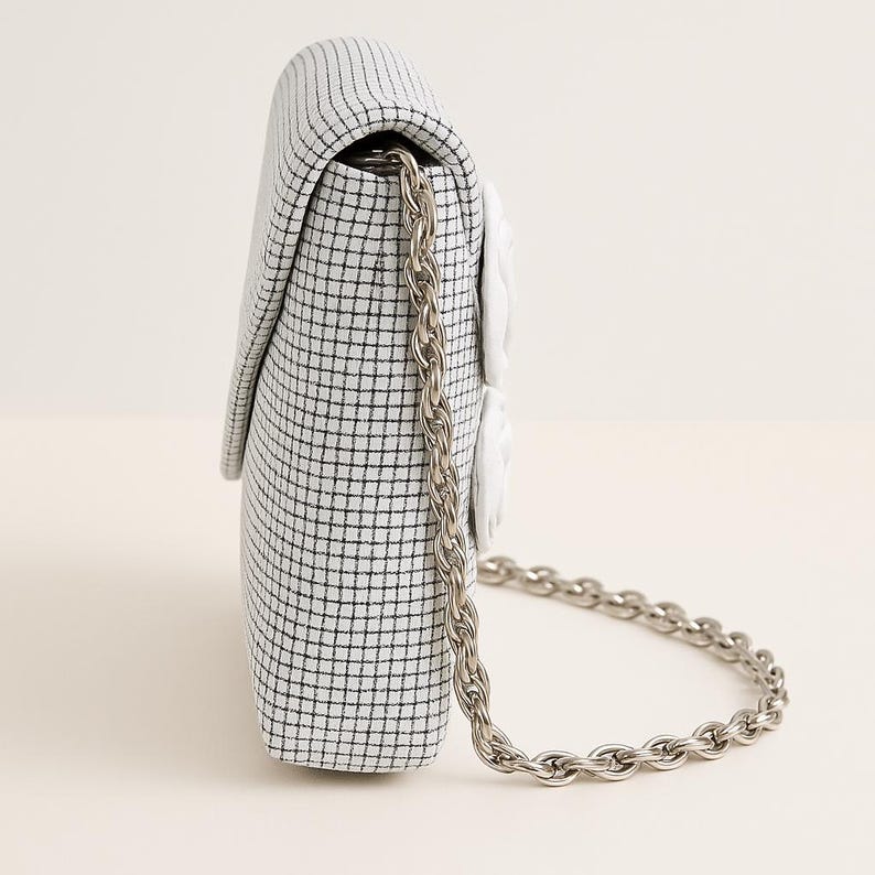 Bring timeless mid-century charm to your collection with this 1960’s vintage Whiting & Davis handbag. Featuring a crisp white grid patterned body, three dimensional rose appliqués on the flap, and a silver-tone chain strap, this bag combines Whiting & Davis craftsmanship with romantic detailing.